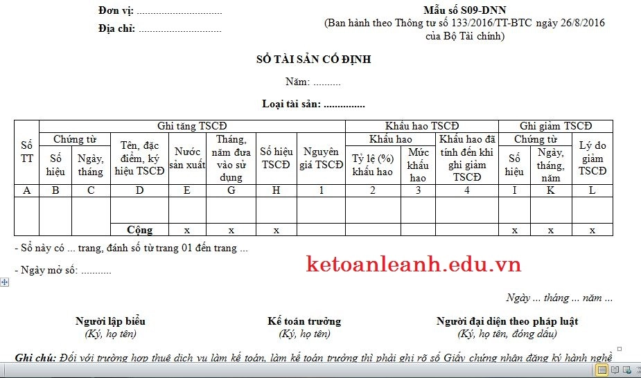 Ngày 28/06/2016 Bộ tài chính ban hành thông tư 133/2016/TT-BTC quy định vể cách lập và sử dụng sổ tài sản cố định mẫu sô S09-DNN là chứng từ kế toán được dùng trong doanh nghiệp dùng để đăng ký và theo dõi quản lý chặt chẽ tài sản tại đơn vị từ khi mua sắm, được đưa vào sử dụng đến khi giảm tài sản cố định.